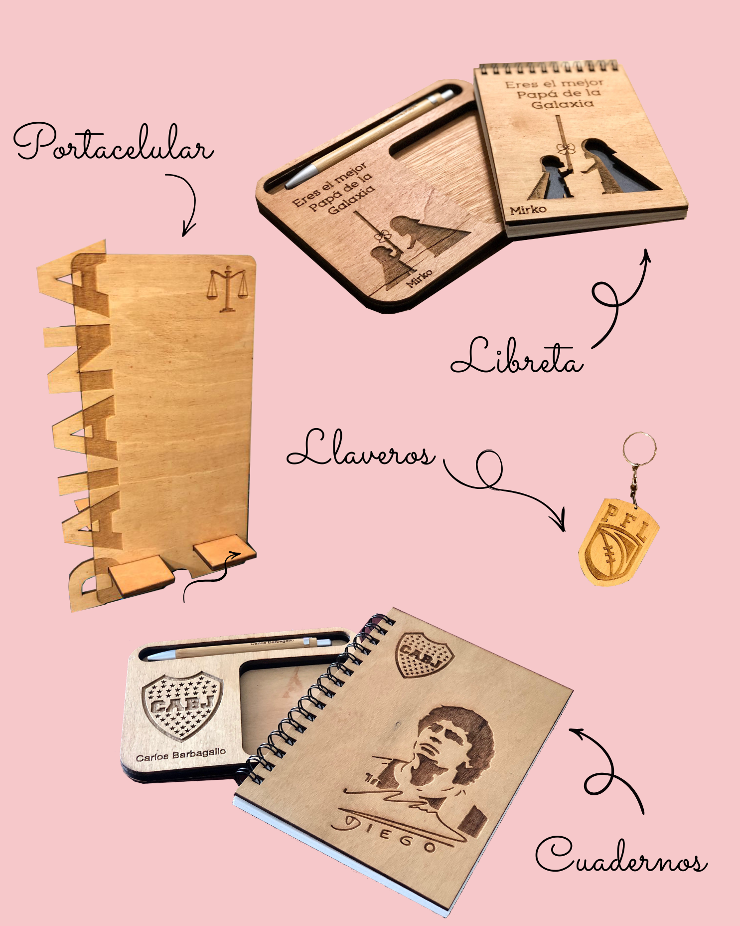 No te olvides de mirar los productos complementarios! También podemos hacer otras cosas personalizadas: cuadernos, llaveros, porta celular y más.