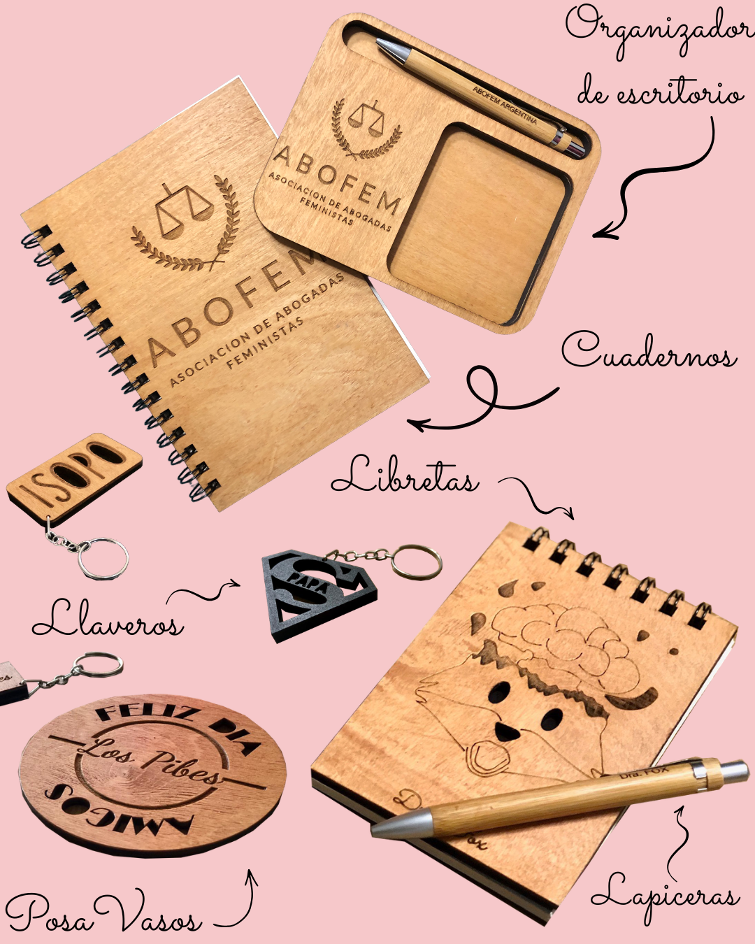 No te olvides de mirar los productos complementarios! También podemos hacer otras cosas personalizadas: cuadernos, llaveros, organizadores de escritorio y más.